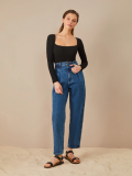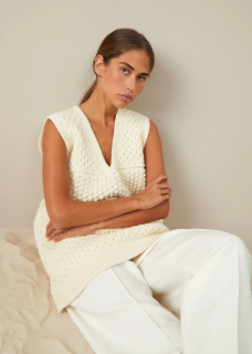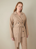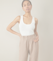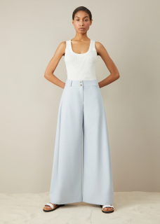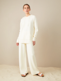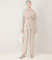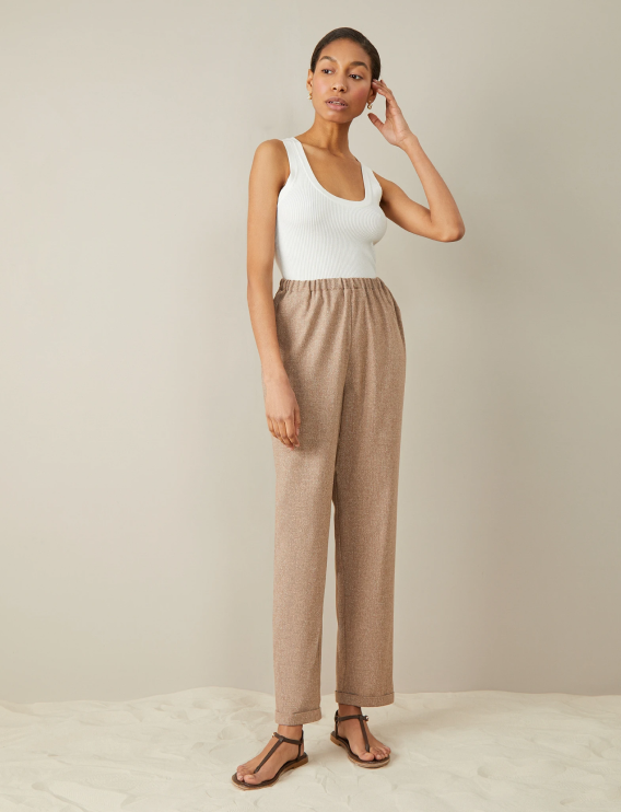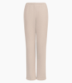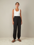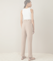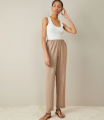 Trousers with an elastic band. Imitation back pocket, lapels at the bottom of the pants. Made of light suit fabric, without lining.